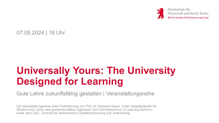 Die Veranstaltungsreihe unter Federführung von Prof. Dr. Susanne Meyer, Erste Vizepräsidentin für Studium und Lehre, wird gemeinschaftlich organisiert vom Schreibzentrum, E-Learning-Zentrum sowie dem ZaQ - Zentrum für akademische Qualitätssicherung und -entwicklung.
